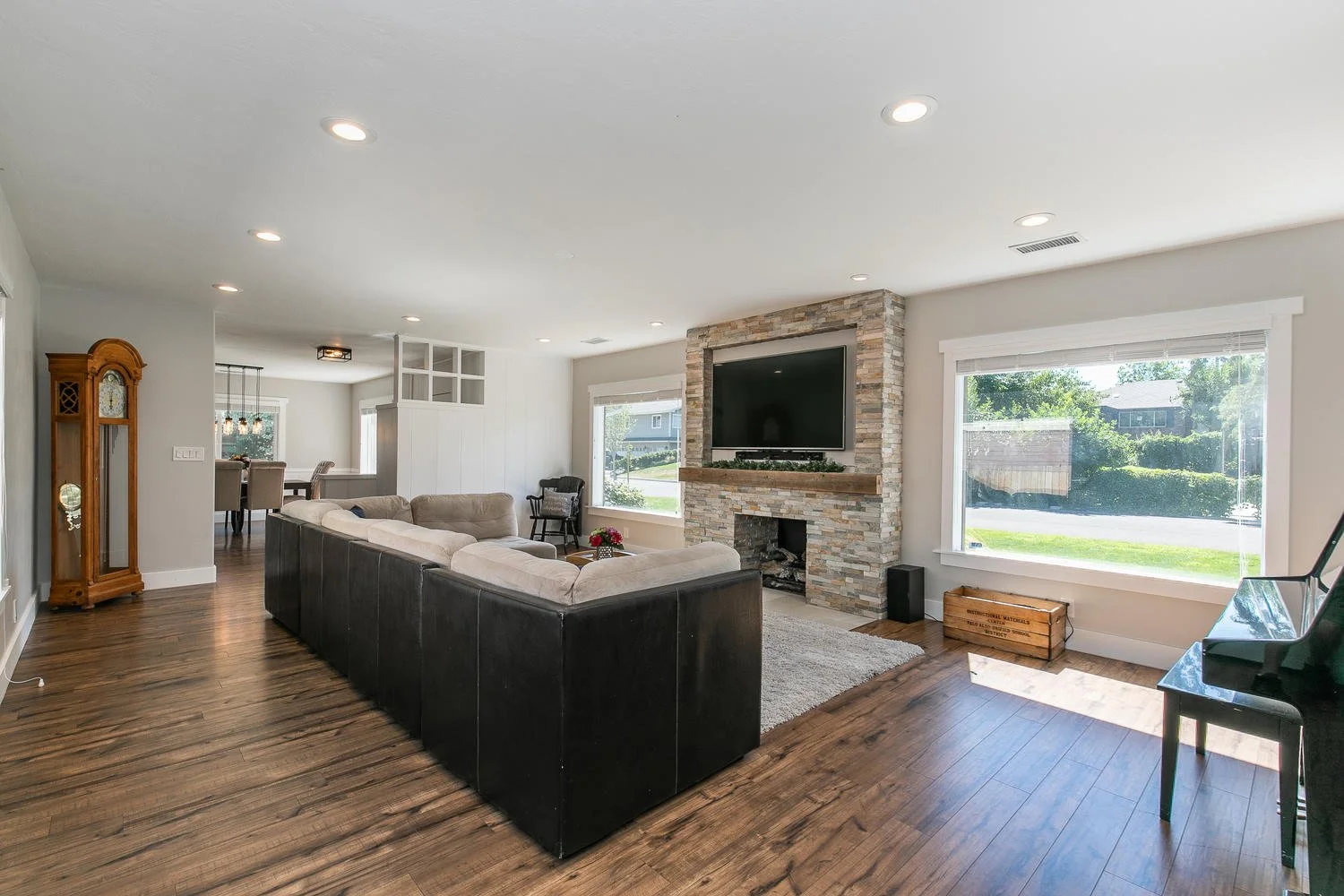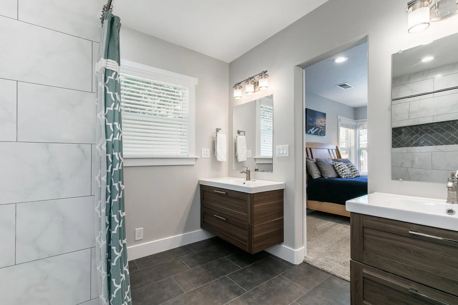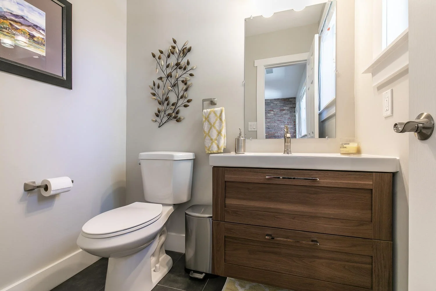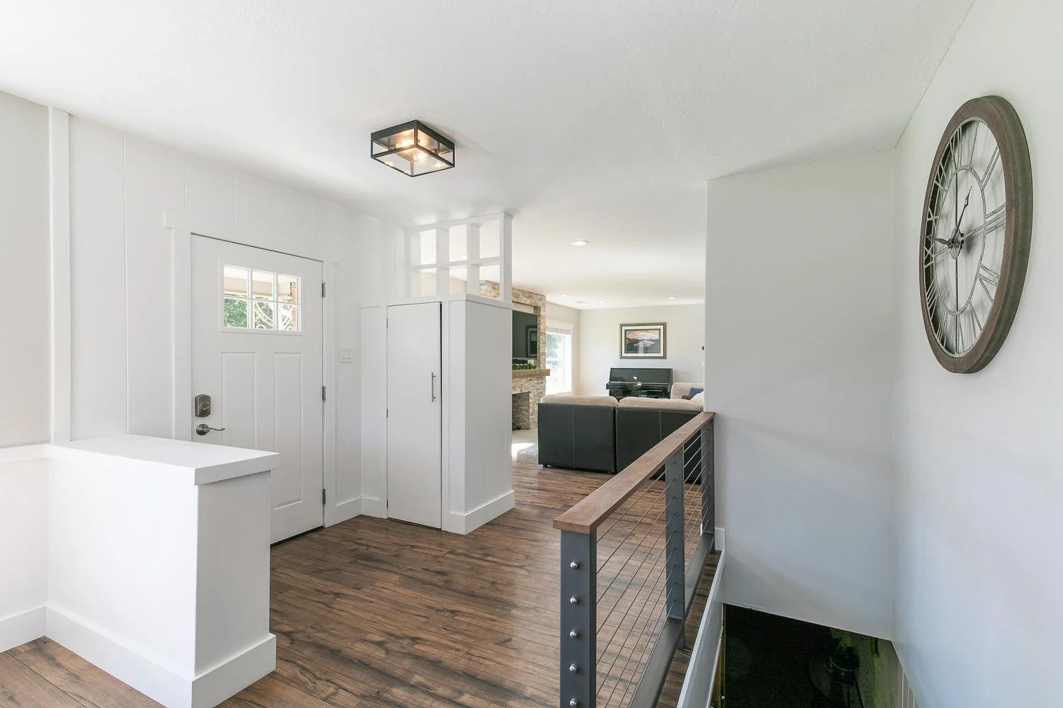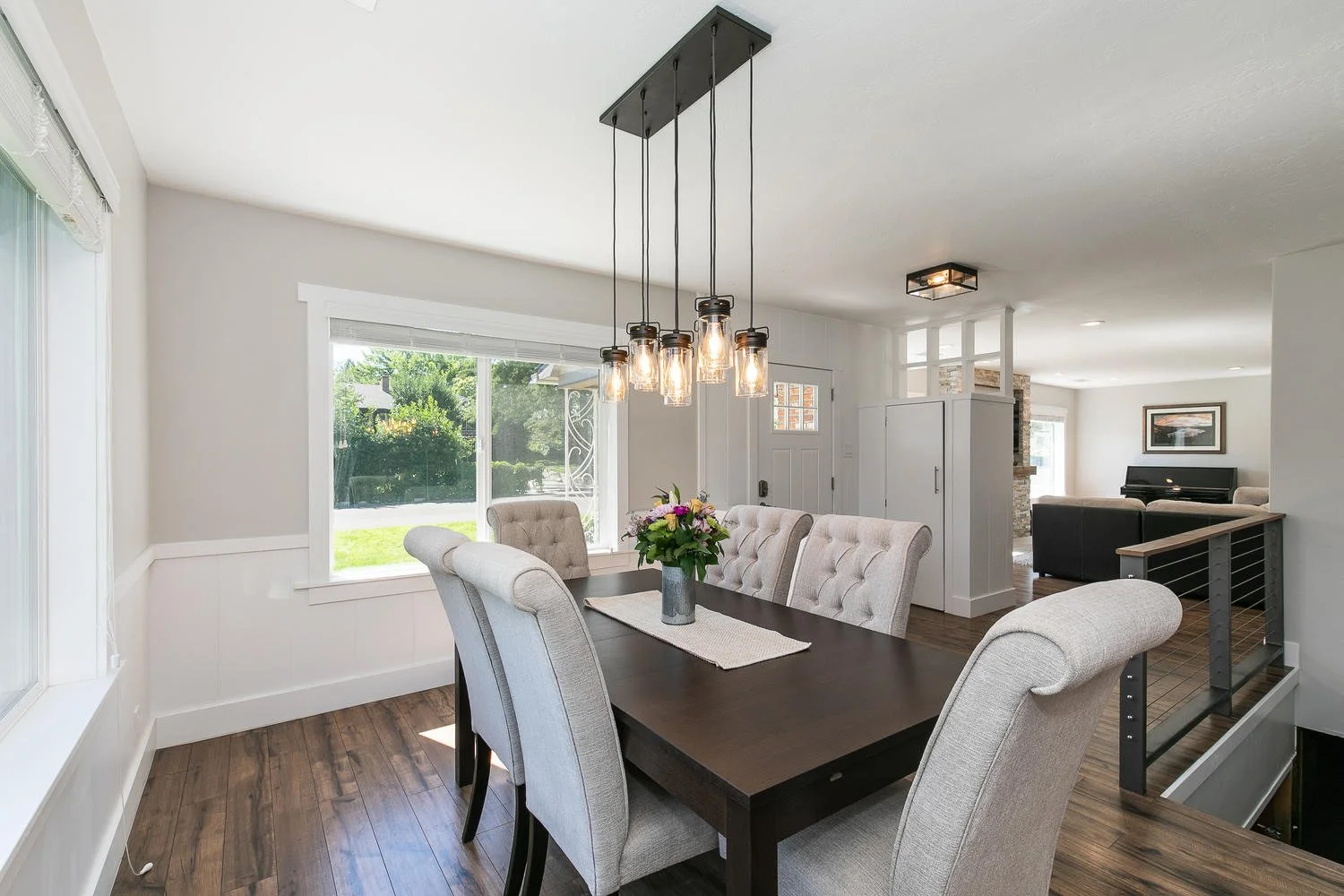 Concrete countertops, bringing the bricks from the exterior inside and custom metal railings made this old home into the new age.
